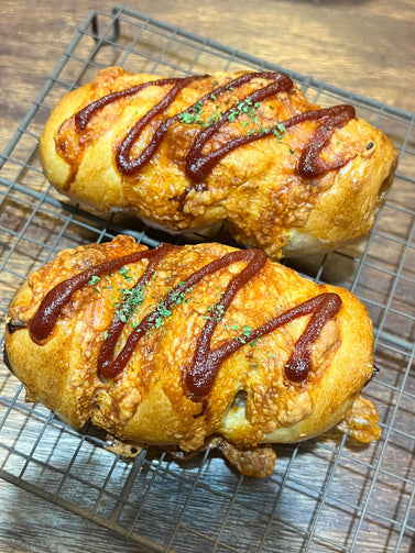 ジョンソンヴィルの大きなソーセージをベーグル生地で巻いて、チーズとケチャップをトッピング。お子様にも大人気です。