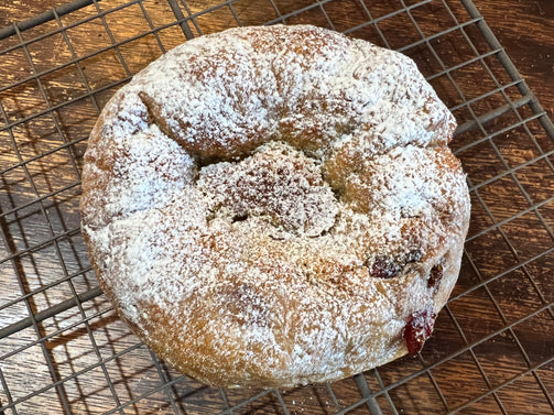 ドライフルーツ、アーモンド、ヘーゼルナッツ、マロングラッセがたっぷり入っています。上にはダマンドをトッピング。冬のお菓子シュトーレン風のベーグルです。