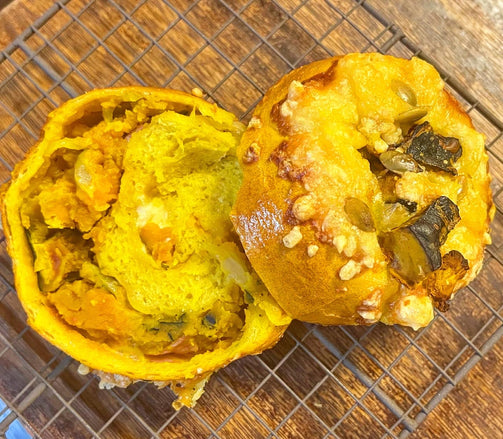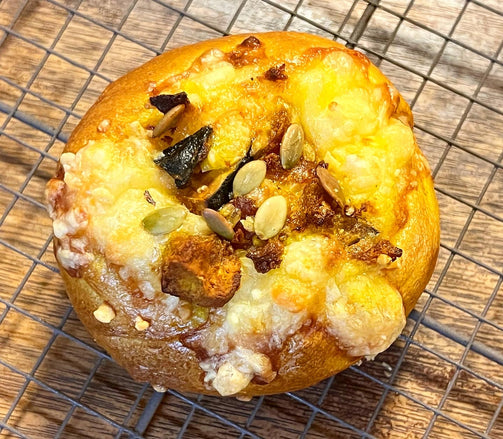 秋限定。大人気ベーコンポテトチーズのかぼちゃ版です。かぼちゃ生地にかぼちゃ、ベーコン、玉ねぎを詰め込んで、チーズまみれにして焼きました。ボリューム満点です。