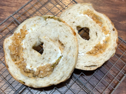 ぶっちぎりNo.1人気の看板メニュー。白ごま生地に、たくあんおかかとクリームチーズ、ちょっぴりネギを入れました。おにぎりを思い出す感じです。